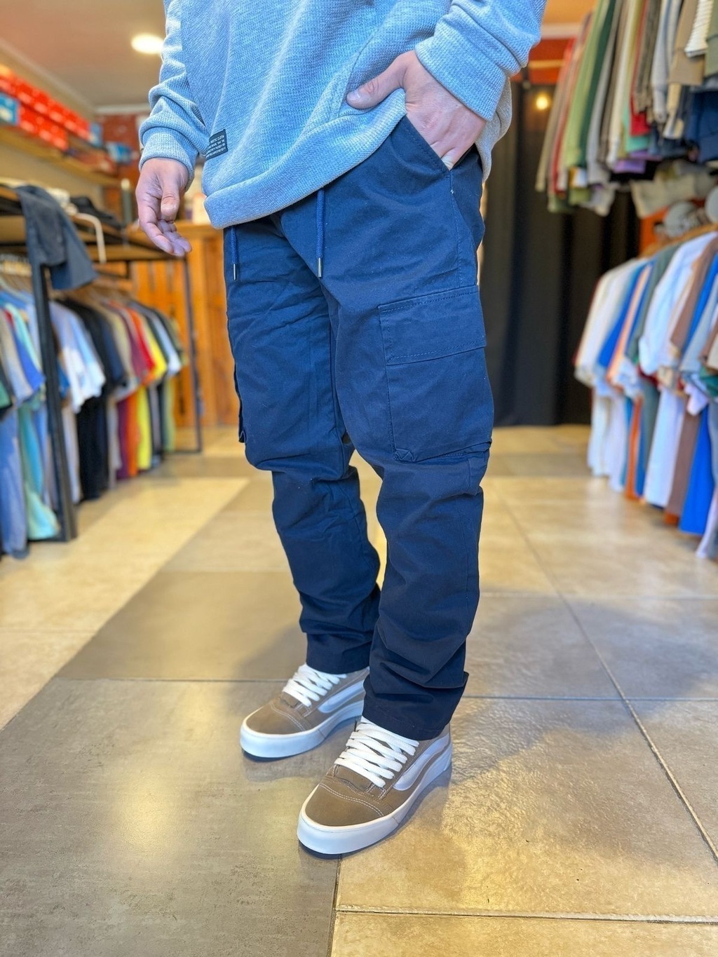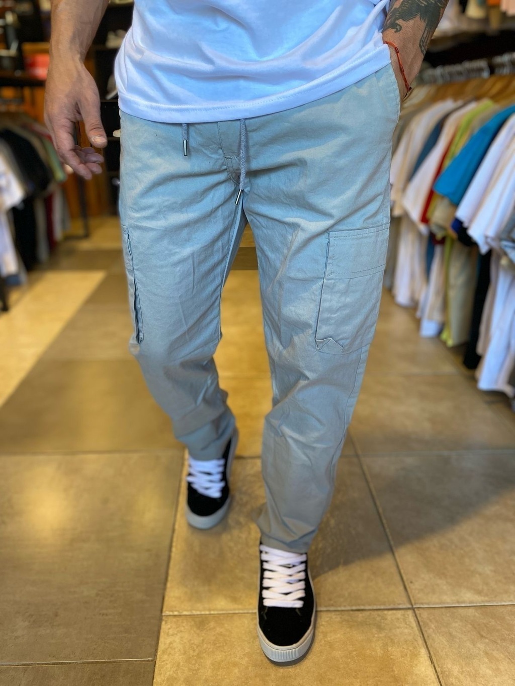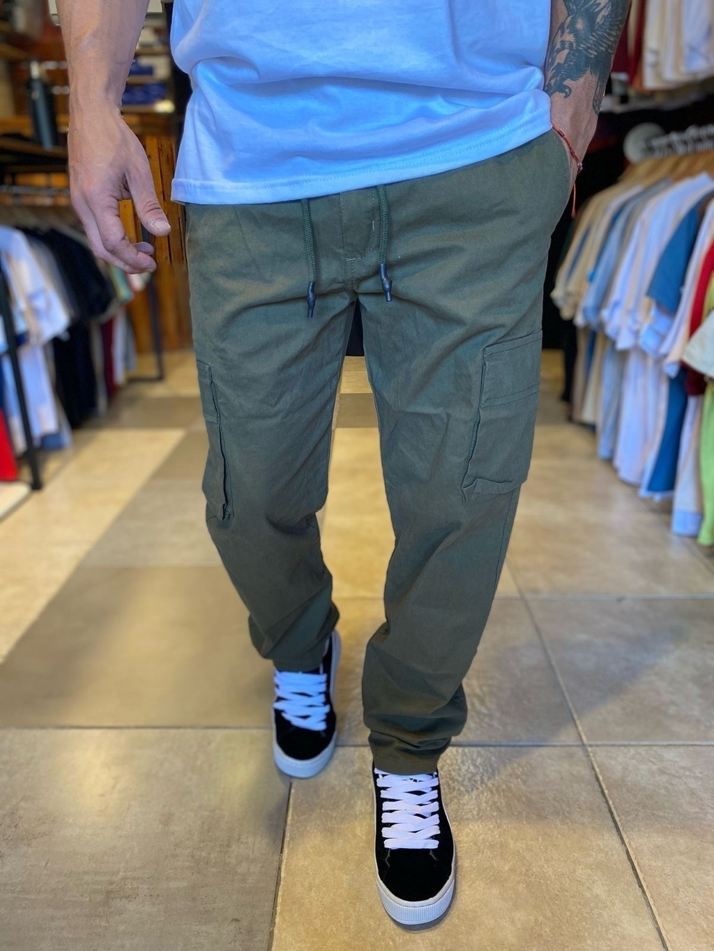 Pantalón cargo de gabardina con bolsillos en los costados, recto, con elástico en la cintura y detalle en cordón para ajustar.